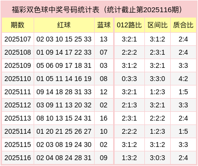 红球三区比3:0:3,质合比为2:4,012路比为1:3:2,蓝球为合数、0路号码。